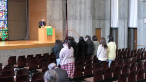 この日の聖句「若き日にあなたの造り主を心に刻め」(コヘレトの言葉12章1節a )が朗読され、チャプレンによる説教が行われました。毎日チャペルに足を運び、聖書の言葉に触れてきた学生たちに向けて、「心に残った聖書の言葉や、気になった箇所はあったでしょうか」と問いかけがなされ、一年の歩みを振り返る時間となりました。